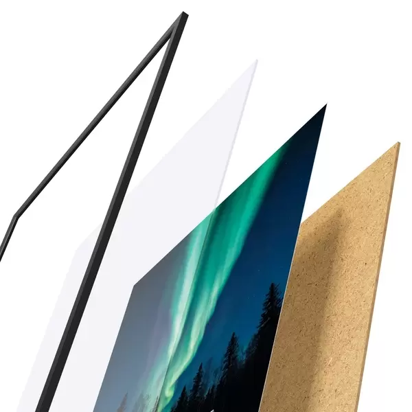 Plakatą sudaro rėmas, pleksiklas, atspausdintas vaizdas ir medžio drožlių plokštės pagrindas. Plakatą galima iš karto pakabinti ant sienos dėl kitoje pusėje esančių laikiklių.