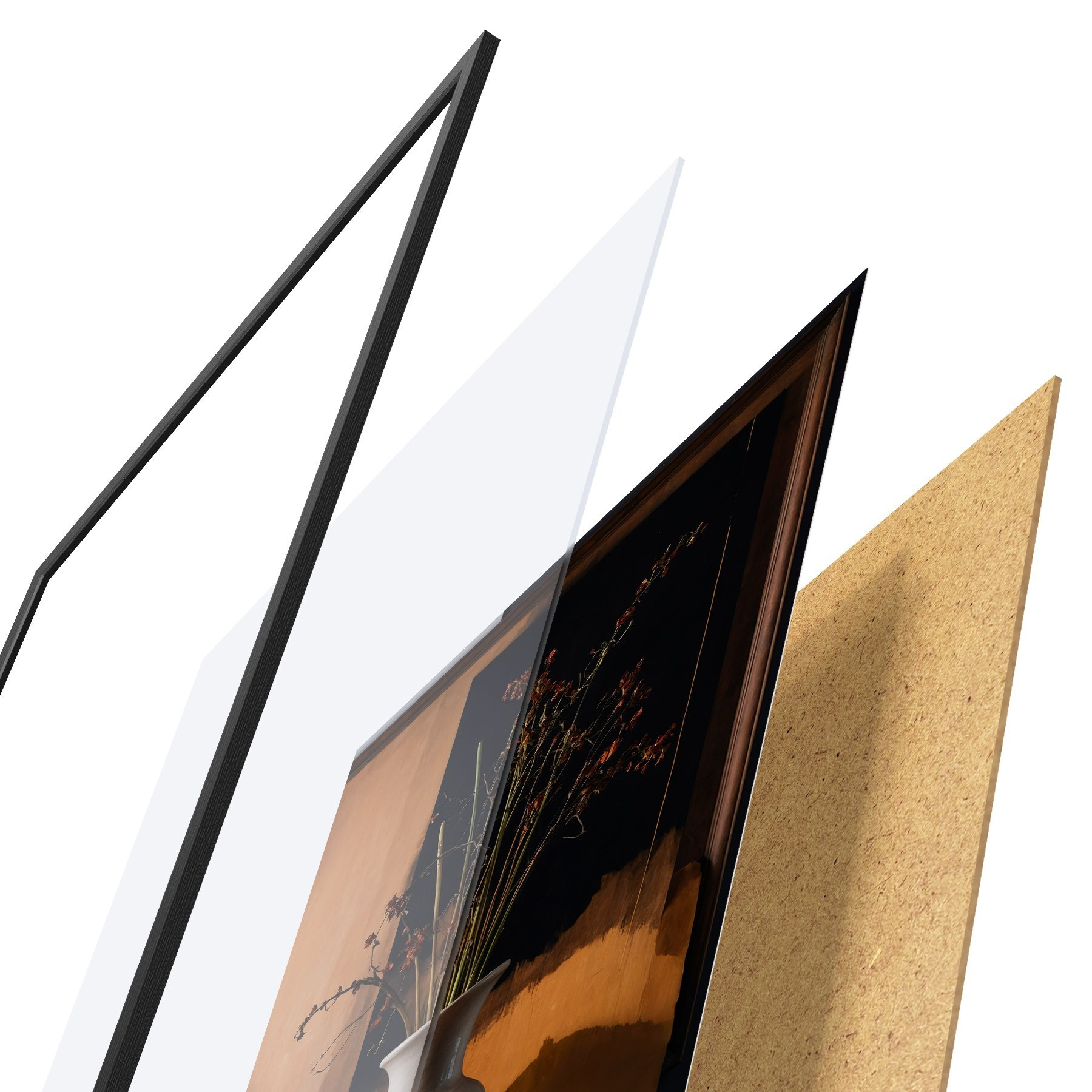 Plakatą sudaro rėmas, pleksiklas, atspausdintas vaizdas ir medžio drožlių plokštės pagrindas. Plakatą galima iš karto pakabinti ant sienos dėl kitoje pusėje esančių laikiklių.