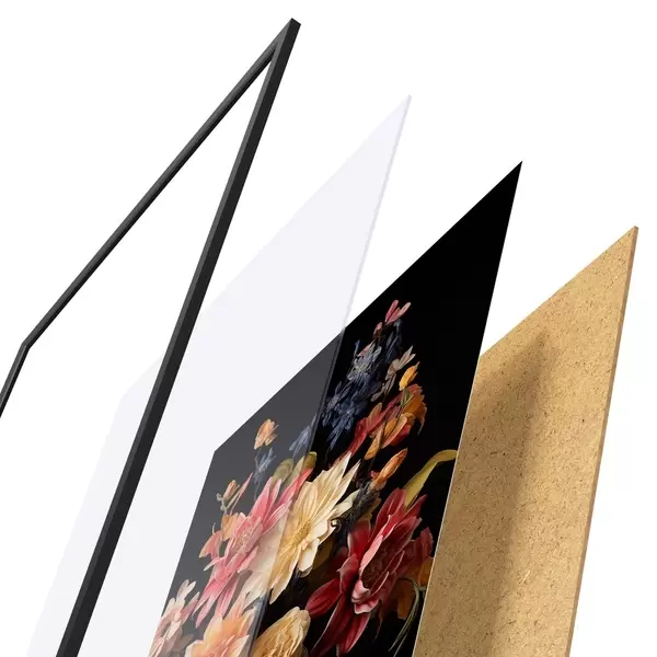 Plakatą sudaro rėmas, pleksiklas, atspausdintas vaizdas ir medžio drožlių plokštės pagrindas. Plakatą galima iš karto pakabinti ant sienos dėl kitoje pusėje esančių laikiklių.