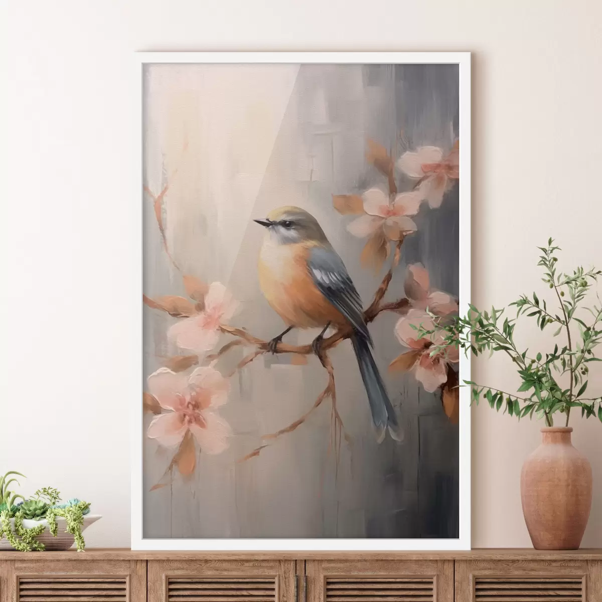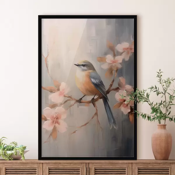 Plakatas Paukštis ant šakos ir rožinės gėlės Ne f42302