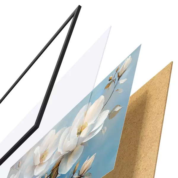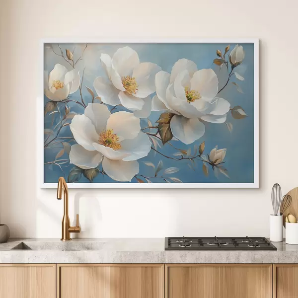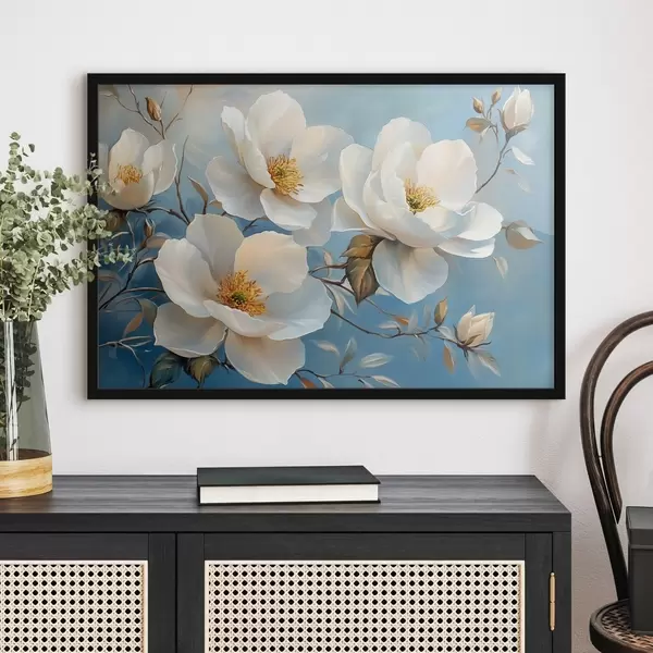 Plakatas Didelės baltos gėlės mėlyname fone f42321