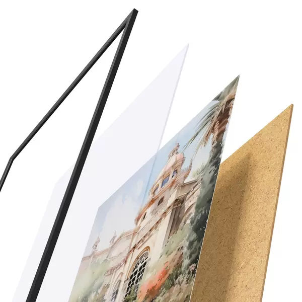 Plakatą sudaro rėmas, pleksiklas, atspausdintas vaizdas ir medžio drožlių plokštės pagrindas. Plakatą galima iš karto pakabinti ant sienos dėl kitoje pusėje esančių laikiklių.