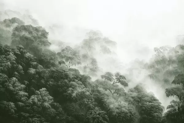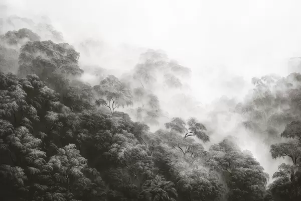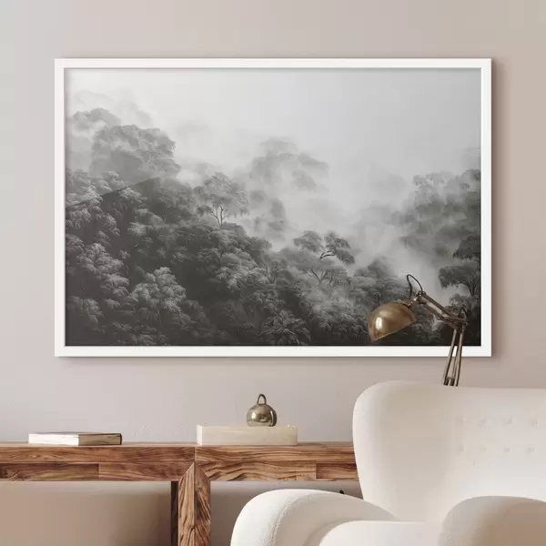 Plakatas Atogrąžų miškas rūke, palmės, pilkos spalvos f42371v1