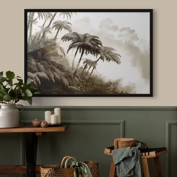 Plakatas Džiunglių miškas rūke, palmės, gamta, smėlio spalvos f42372