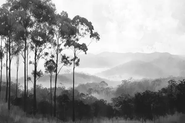 Plakatas Mistinis miškas pilkuose tonuose, gamtos peizažas, medžiai f42373