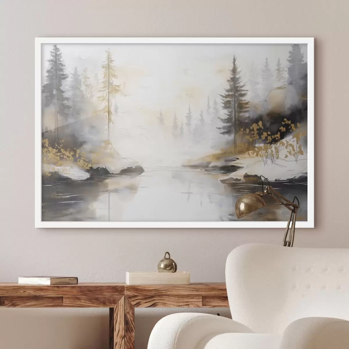 Plakatas Gamtos peizažas su upe, mišku ir pušimis, švelnios pastelinės spalvos Ne f42375
