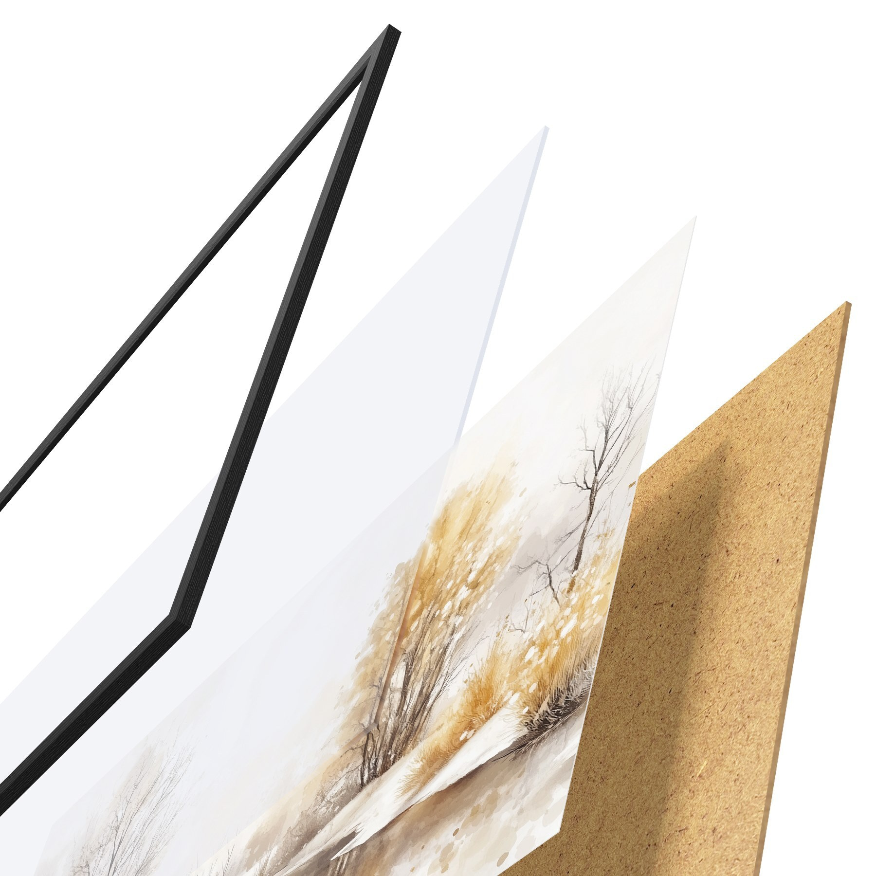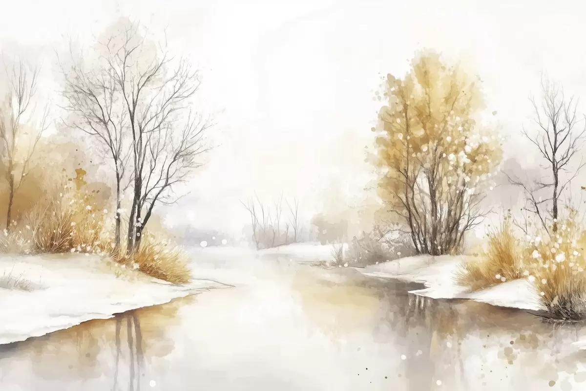 Plakatas Žiemos kraštovaizdis, upė ir medžiai, akvarelės stilius, smėlio spalvos f42376