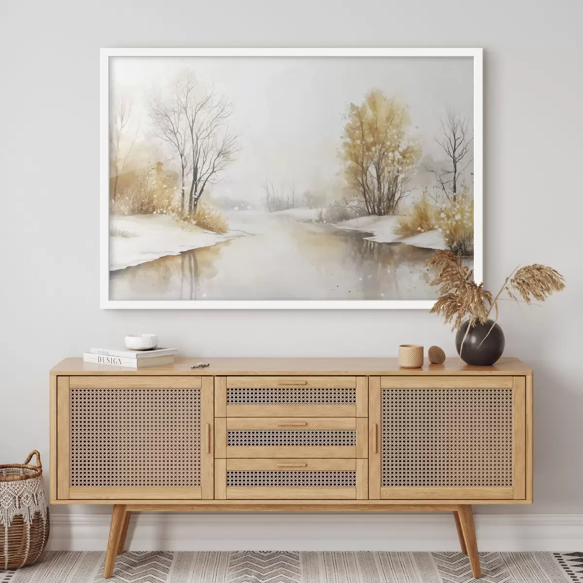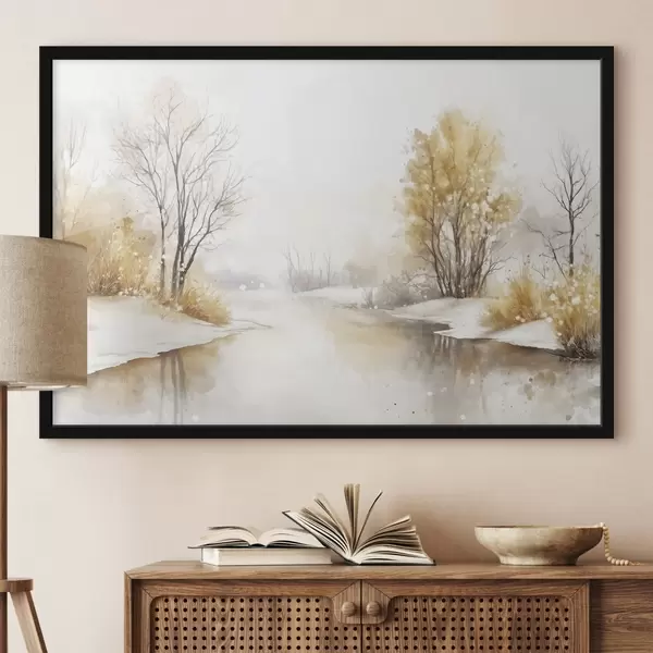 Plakatas Žiemos kraštovaizdis, upė ir medžiai, akvarelės stilius, smėlio spalvos Ne f42376