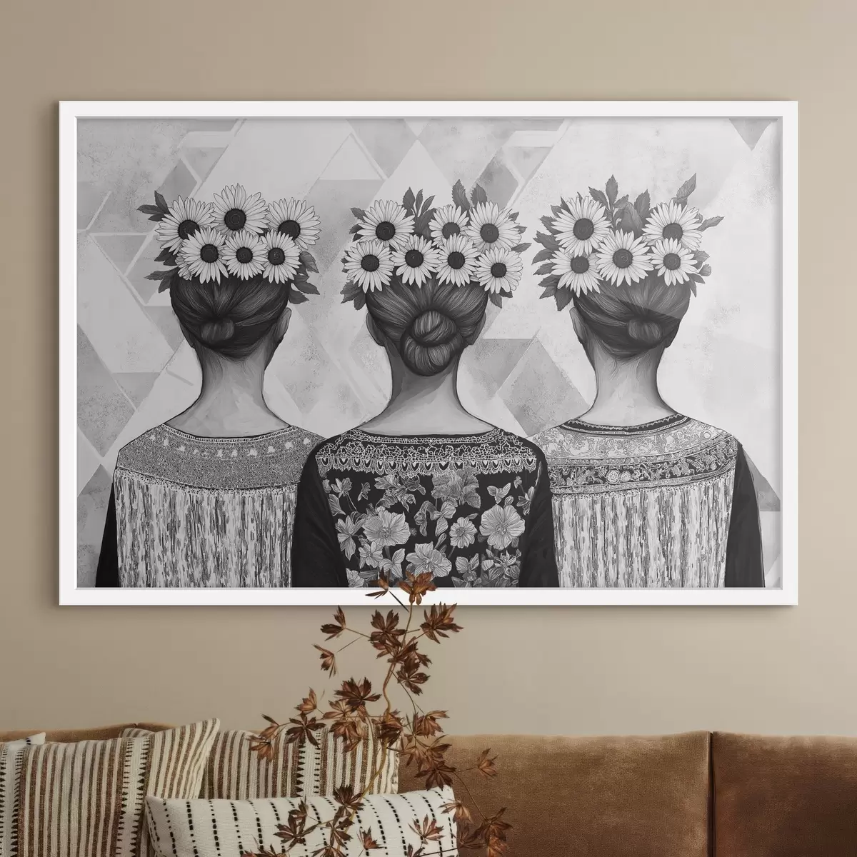 Plakatas Trys moterys tautiniais drabužiais, pieštuko stiliaus piešinys, saulėgrąžos f42377