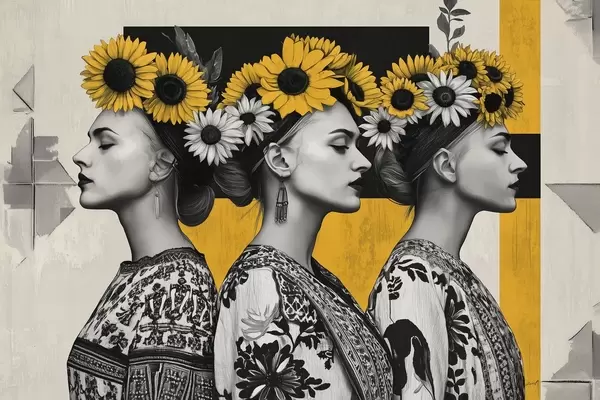 Plakatas Gražios moterys etniniais drabužiais su saulėgrąžų raktais f42378