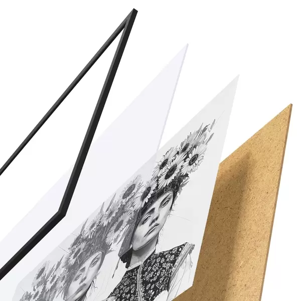 Plakatą sudaro rėmas, pleksiklas, atspausdintas vaizdas ir medžio drožlių plokštės pagrindas. Plakatą galima iš karto pakabinti ant sienos dėl kitoje pusėje esančių laikiklių.