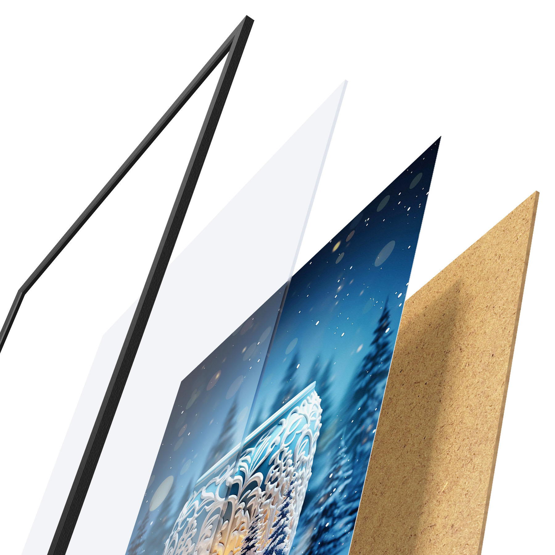 Plakatą sudaro rėmas, pleksiklas, atspausdintas vaizdas ir medžio drožlių plokštės pagrindas. Plakatą galima iš karto pakabinti ant sienos dėl kitoje pusėje esančių laikiklių.