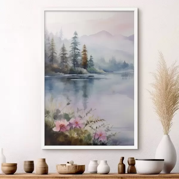 Plakatas Miškas rūke ežero fone f42384