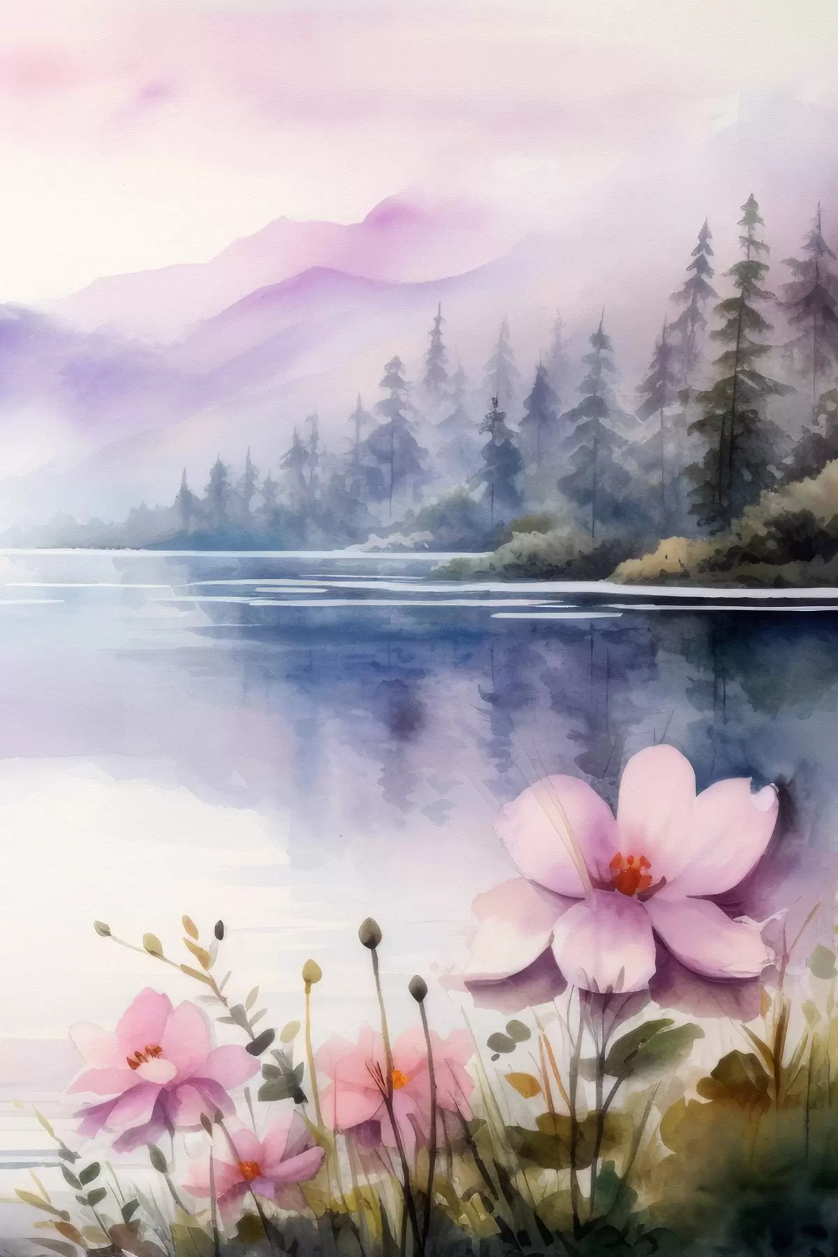 Plakatas Rožinės gėlės kalnų ežero fone Ne f42393