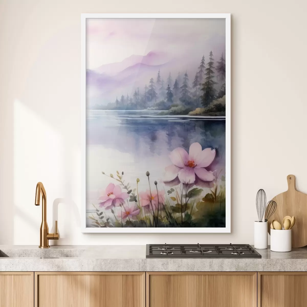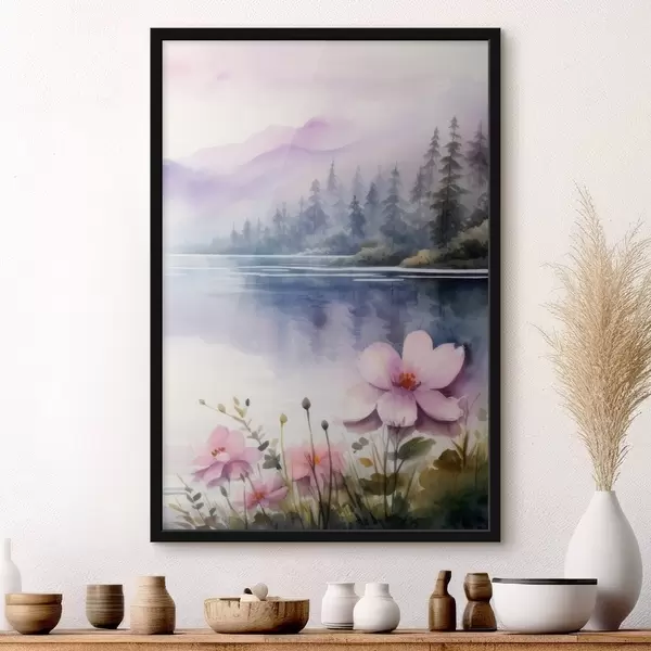 Plakatas Rožinės gėlės kalnų ežero fone f42393