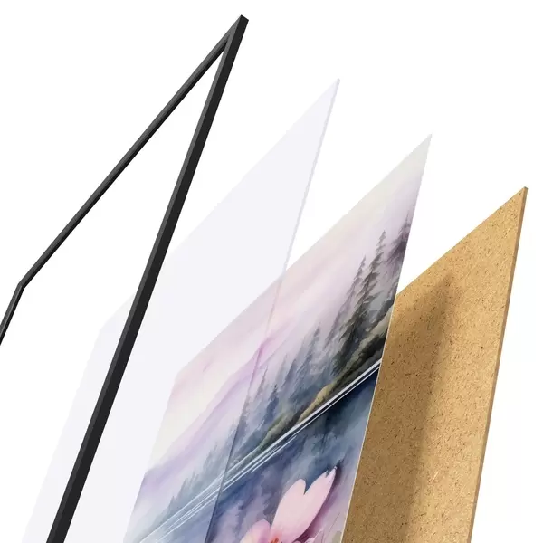 Plakatą sudaro rėmas, pleksiklas, atspausdintas vaizdas ir medžio drožlių plokštės pagrindas. Plakatą galima iš karto pakabinti ant sienos dėl kitoje pusėje esančių laikiklių.