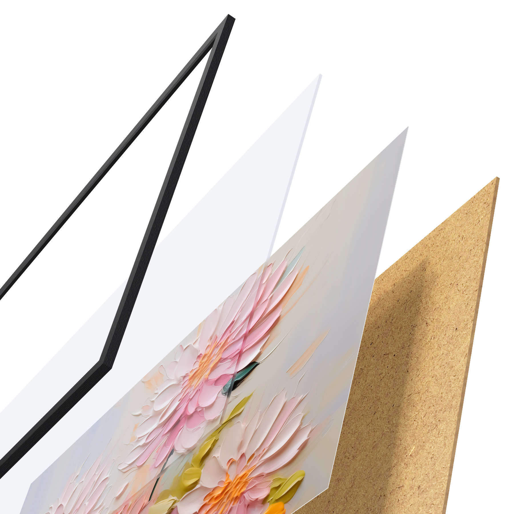 Plakatą sudaro rėmas, pleksiklas, atspausdintas vaizdas ir medžio drožlių plokštės pagrindas. Plakatą galima iš karto pakabinti ant sienos dėl kitoje pusėje esančių laikiklių.
