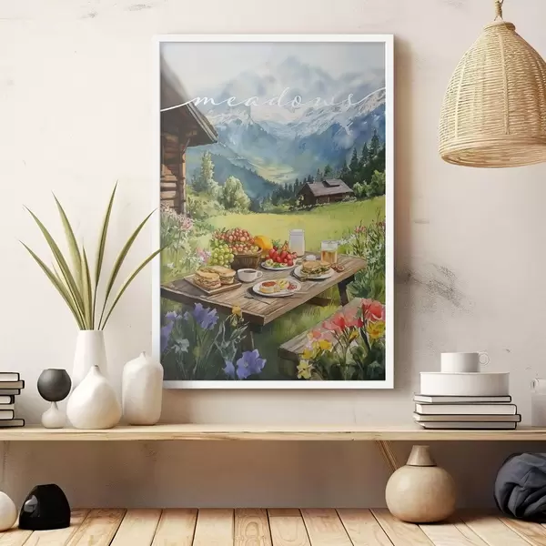 Plakatas Kalnų kraštovaizdžiai, vasaros pieva, mediniai namai, pusryčiai f42425