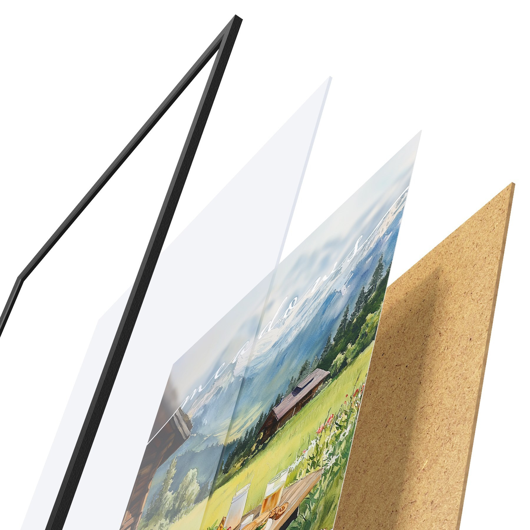 Plakatą sudaro rėmas, pleksiklas, atspausdintas vaizdas ir medžio drožlių plokštės pagrindas. Plakatą galima iš karto pakabinti ant sienos dėl kitoje pusėje esančių laikiklių.