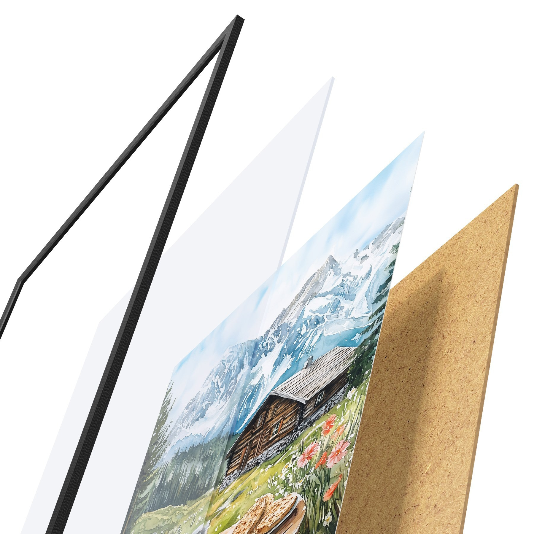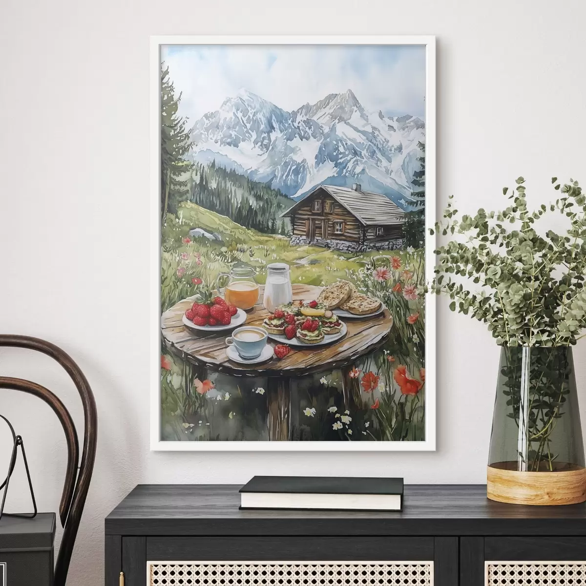 Plakatas Gražūs vasaros peizažai su kalnais, mišku ir gėlėmis, pusryčiai, akvarelės stilius f42427