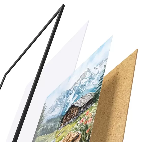 Plakatą sudaro rėmas, pleksiklas, atspausdintas vaizdas ir medžio drožlių plokštės pagrindas. Plakatą galima iš karto pakabinti ant sienos dėl kitoje pusėje esančių laikiklių.