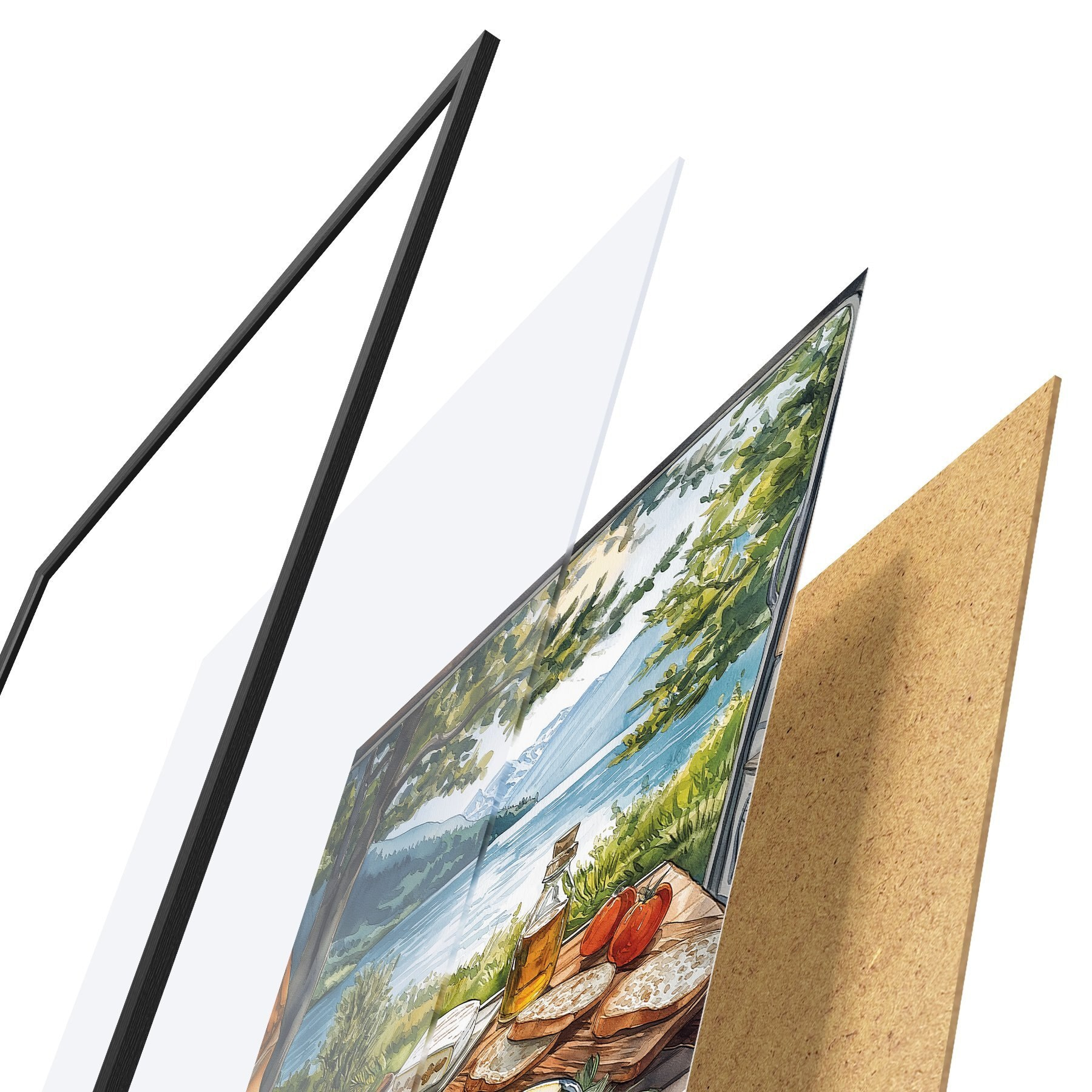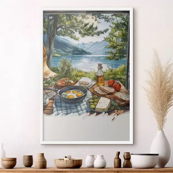 Plakatas Stovyklavimo estetika, akvarelės stilius, vasaros ežeras, gamta, maistas f42428