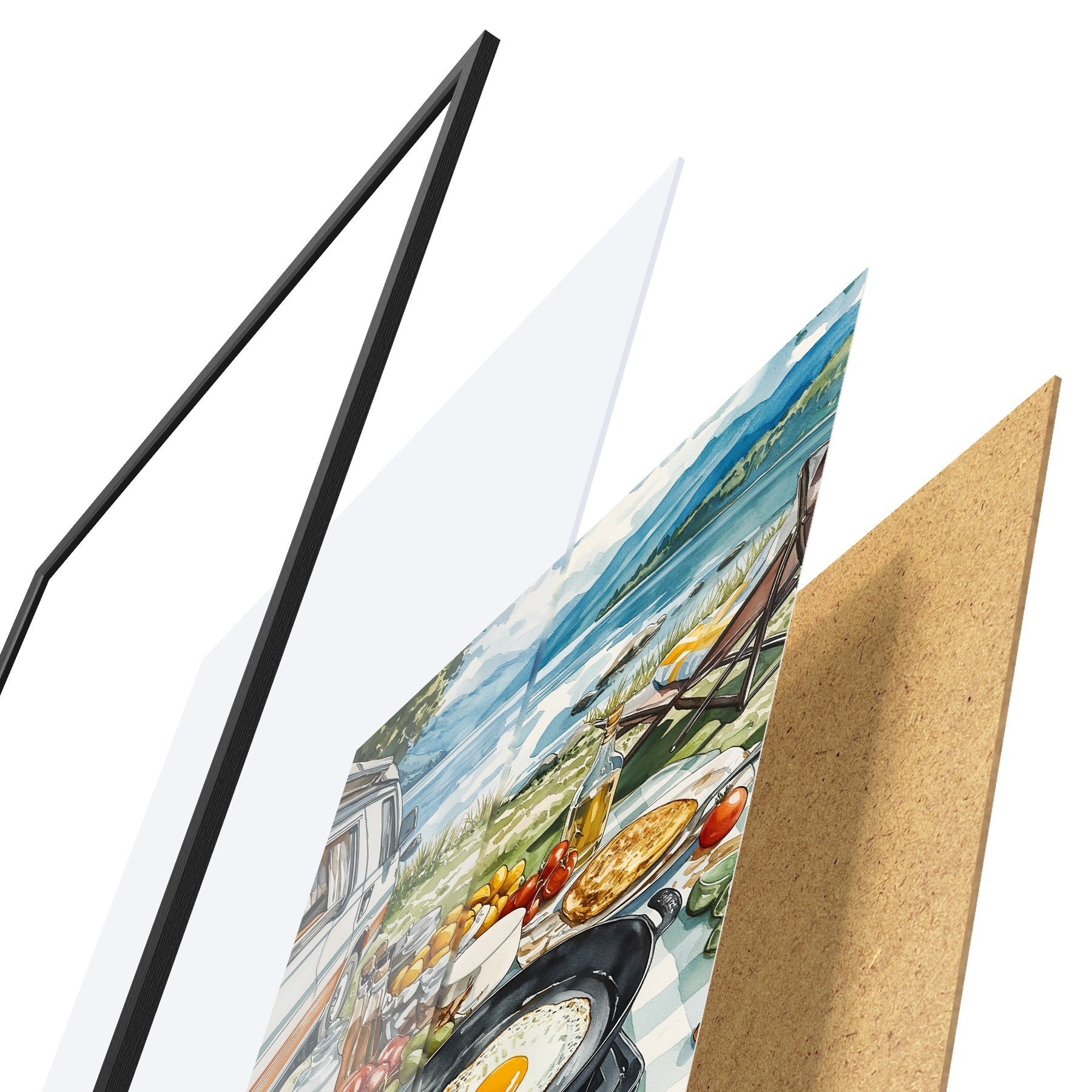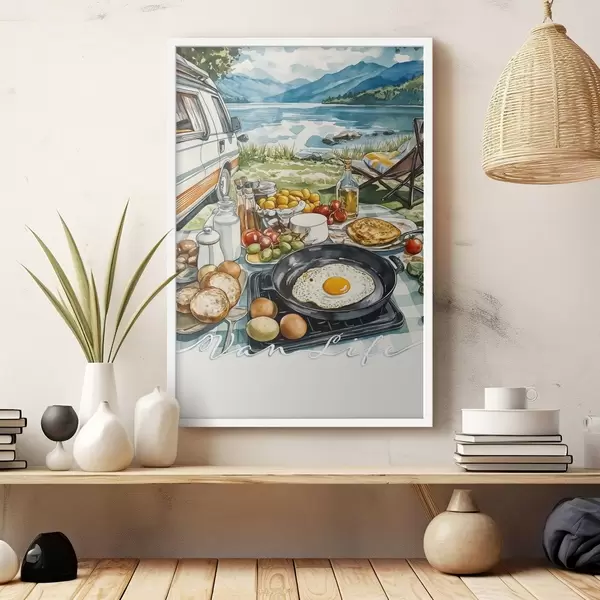 Plakatas Gražūs akvarelės stiliaus pusryčiai, furgono gyvenimas, stovyklavimas, kalnai Ne f42429