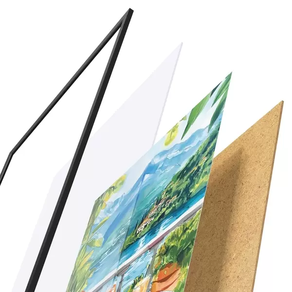 Plakatą sudaro rėmas, pleksiklas, atspausdintas vaizdas ir medžio drožlių plokštės pagrindas. Plakatą galima iš karto pakabinti ant sienos dėl kitoje pusėje esančių laikiklių.