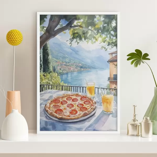 Plakatas Priešpiečiai Italijoje, akvarelės stilius, pica margarita, ežeras, vasaros gamta f42436