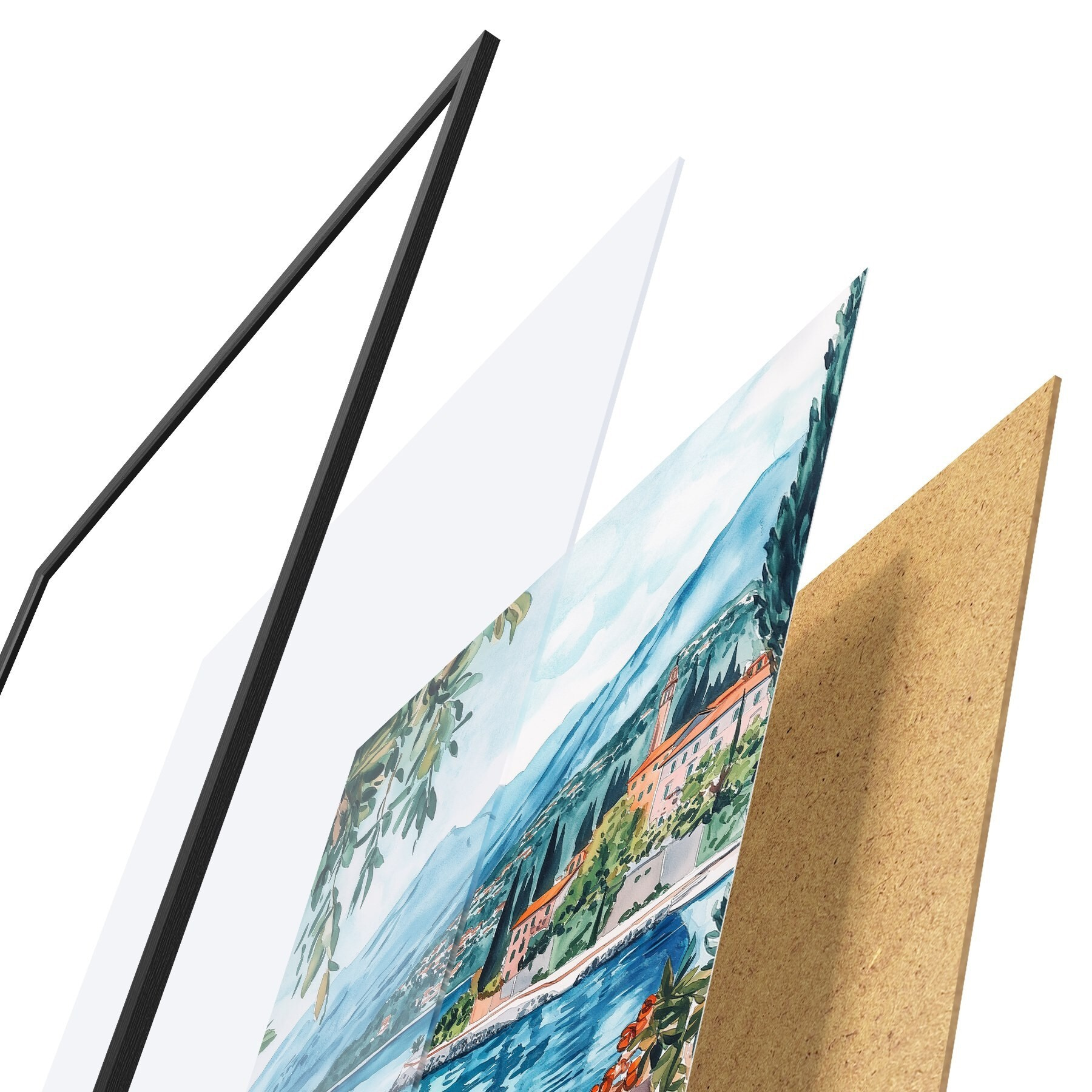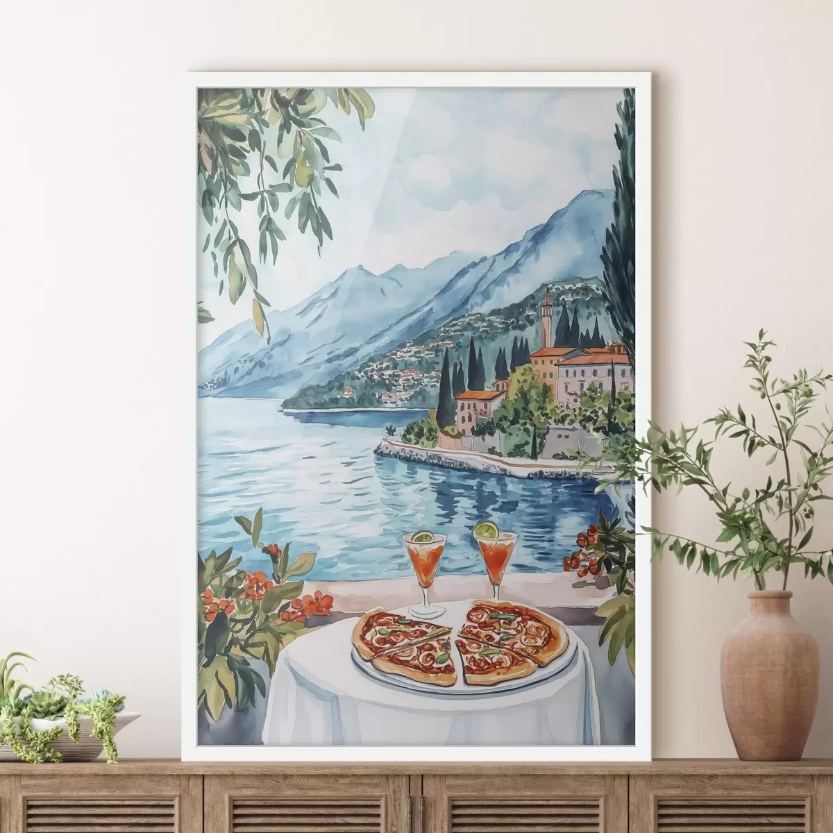 Plakatas Komo ežeras, Italija, akvarelės stilius, pica, kokteiliai, senamiestis, kalnai f42437