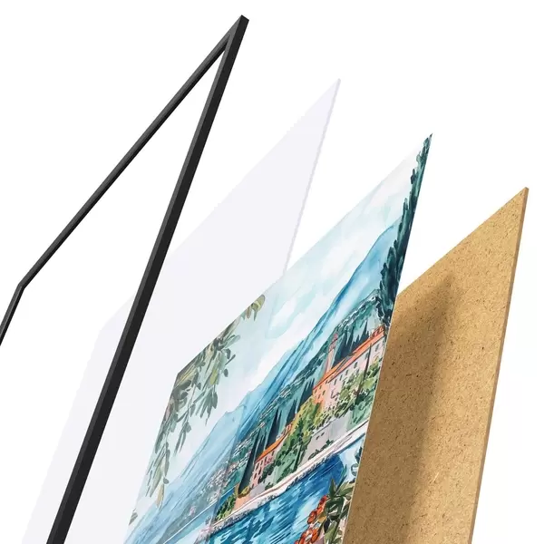 Plakatą sudaro rėmas, pleksiklas, atspausdintas vaizdas ir medžio drožlių plokštės pagrindas. Plakatą galima iš karto pakabinti ant sienos dėl kitoje pusėje esančių laikiklių.