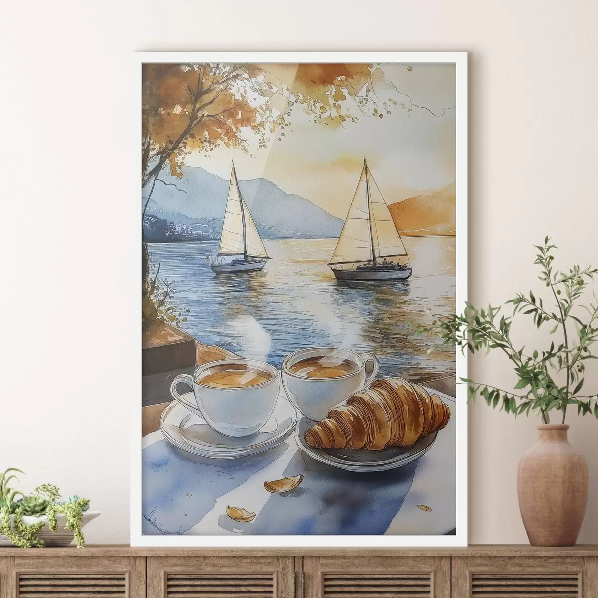 Plakatas Saulėlydis ežere, burlaiviai, kavos puodeliai, akvarelės stilius f42442