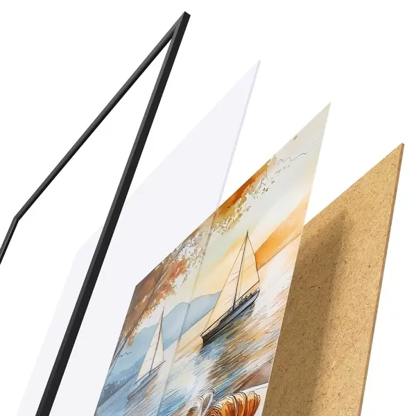 Plakatą sudaro rėmas, pleksiklas, atspausdintas vaizdas ir medžio drožlių plokštės pagrindas. Plakatą galima iš karto pakabinti ant sienos dėl kitoje pusėje esančių laikiklių.