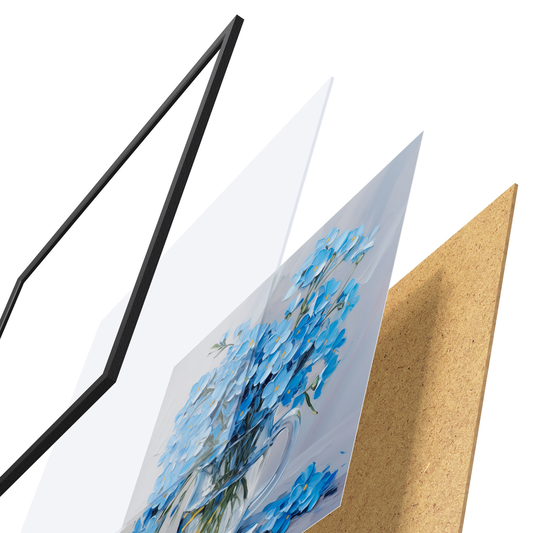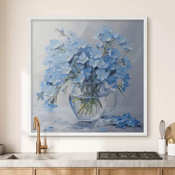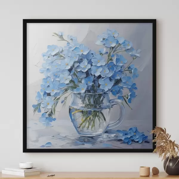 Plakatas Mėlynos gėlės skaidrioje vazoje, imituojančios tapybą Ne f42467