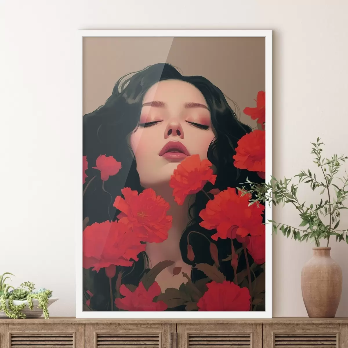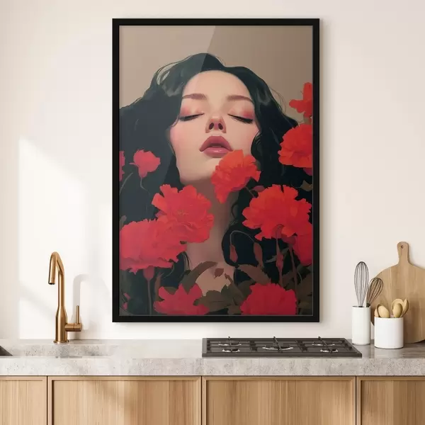 Plakatas Moters portretas tarp raudonų gėlių f42478