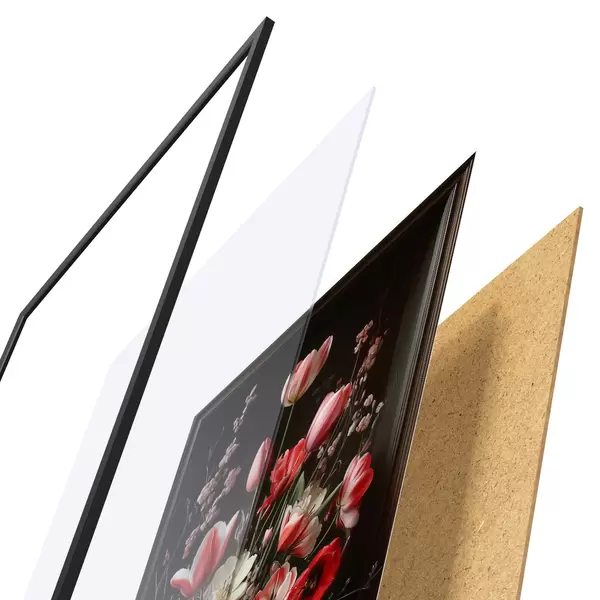 Plakatą sudaro rėmas, pleksiklas, atspausdintas vaizdas ir medžio drožlių plokštės pagrindas. Plakatą galima iš karto pakabinti ant sienos dėl kitoje pusėje esančių laikiklių.