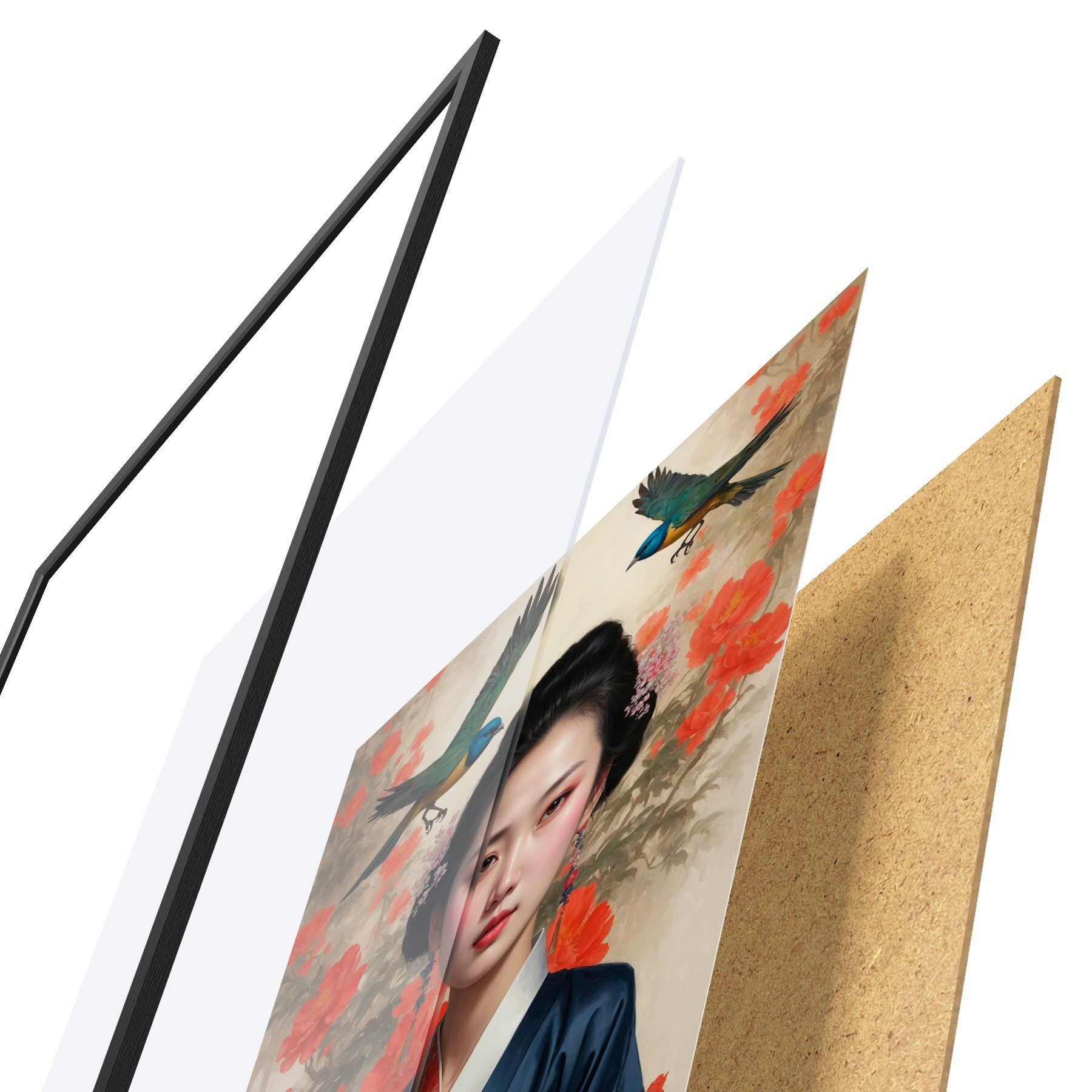 Plakatą sudaro rėmas, pleksiklas, atspausdintas vaizdas ir medžio drožlių plokštės pagrindas. Plakatą galima iš karto pakabinti ant sienos dėl kitoje pusėje esančių laikiklių.