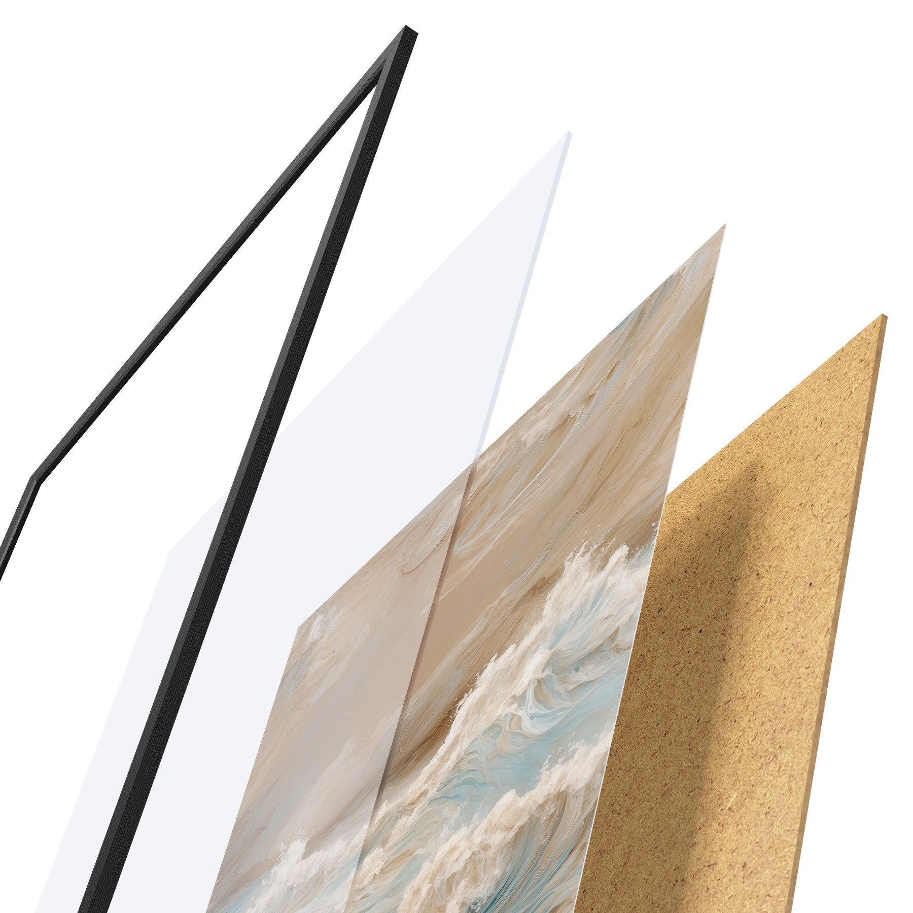 Plakatą sudaro rėmas, pleksiklas, atspausdintas vaizdas ir medžio drožlių plokštės pagrindas. Plakatą galima iš karto pakabinti ant sienos dėl kitoje pusėje esančių laikiklių.