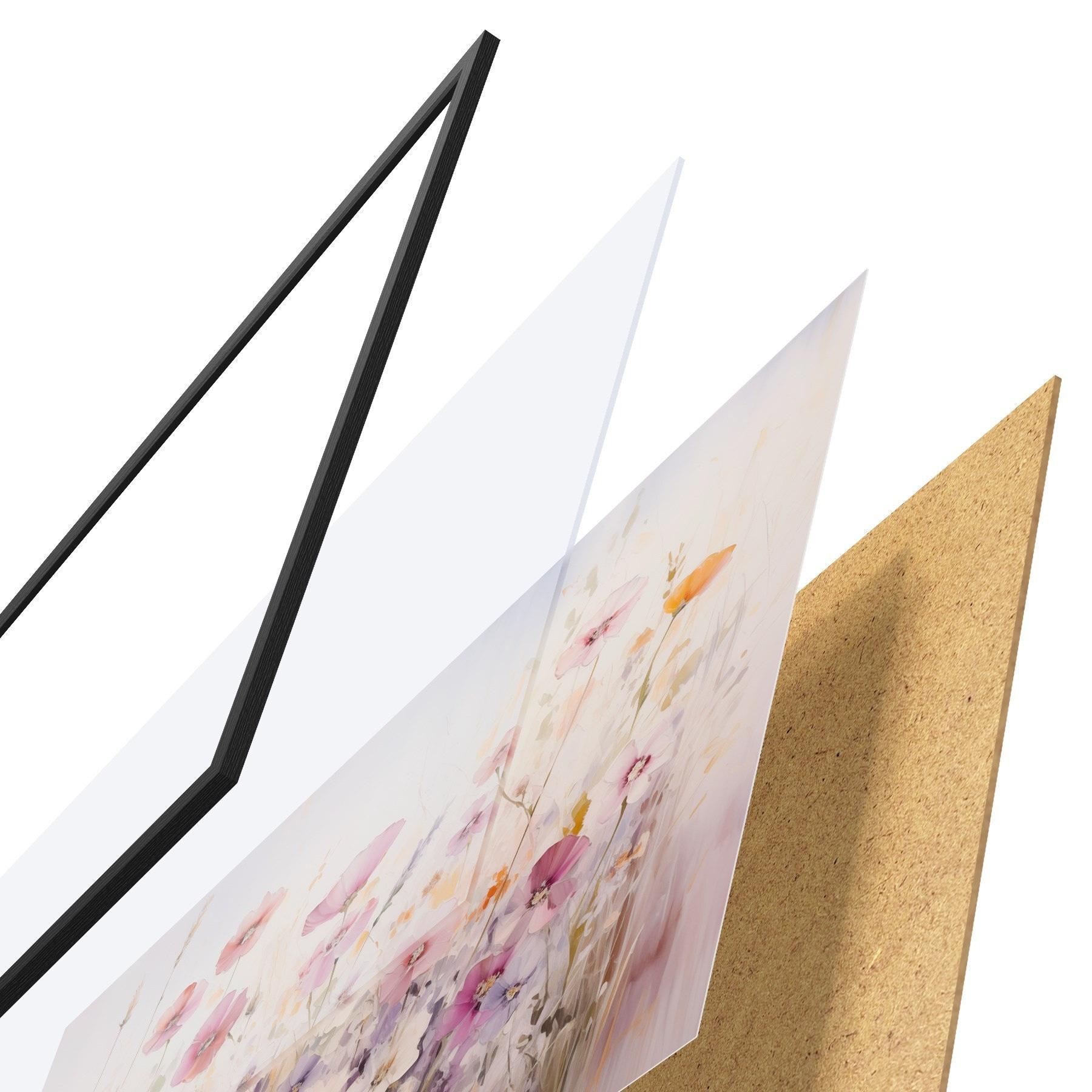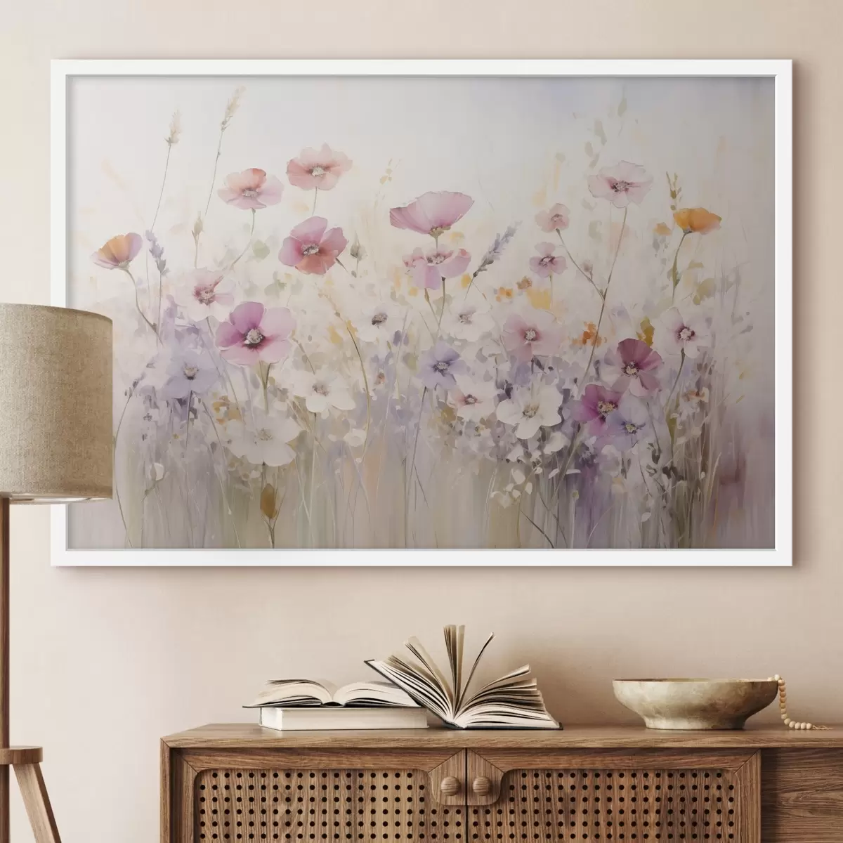 Plakatas Pieva su akvarelinėmis švelnių rožinių, violetinių ir baltų atspalvių gėlėmis, kuriančiomis lengvumo ir harmonijos atmosferą. Ne f42557