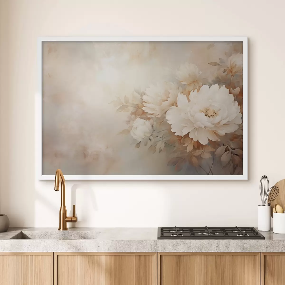 Plakatas Švelnūs pastelinių kreminių tonų bijūnai neryškiame fone sukuria švelnią ir romantišką nuotaiką. f42558
