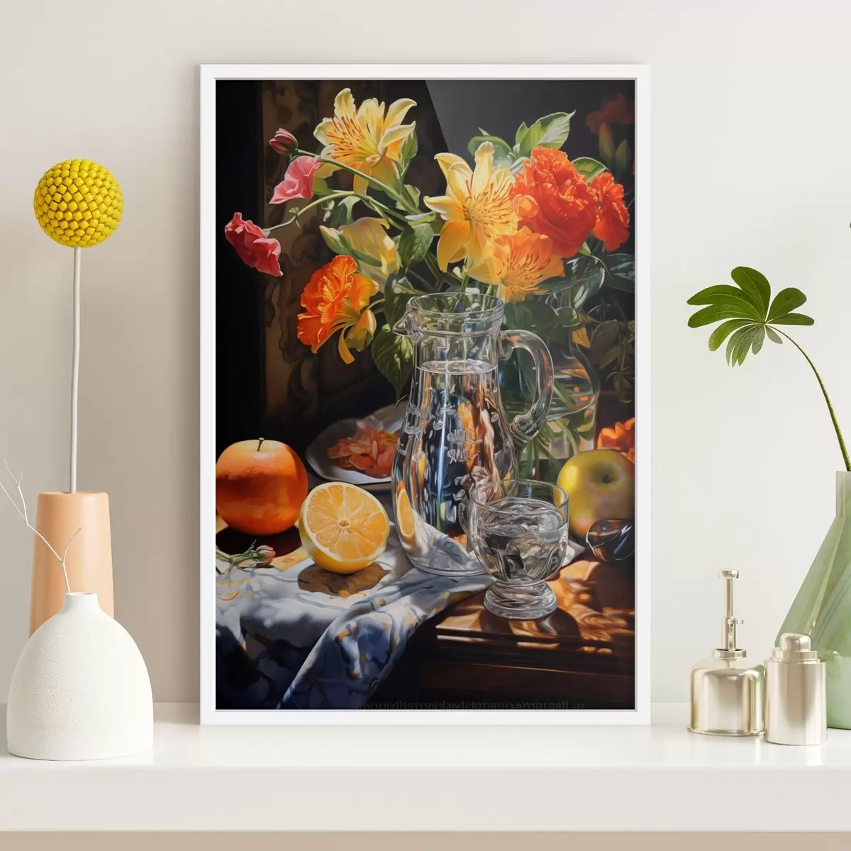 Plakatas Natiurmortas su ryškių geltonų ir raudonų gėlių puokšte, stikliniu ąsočiu, citrusiniais vaisiais ir obuoliais ant apšviesto stalo. Ne f42560
