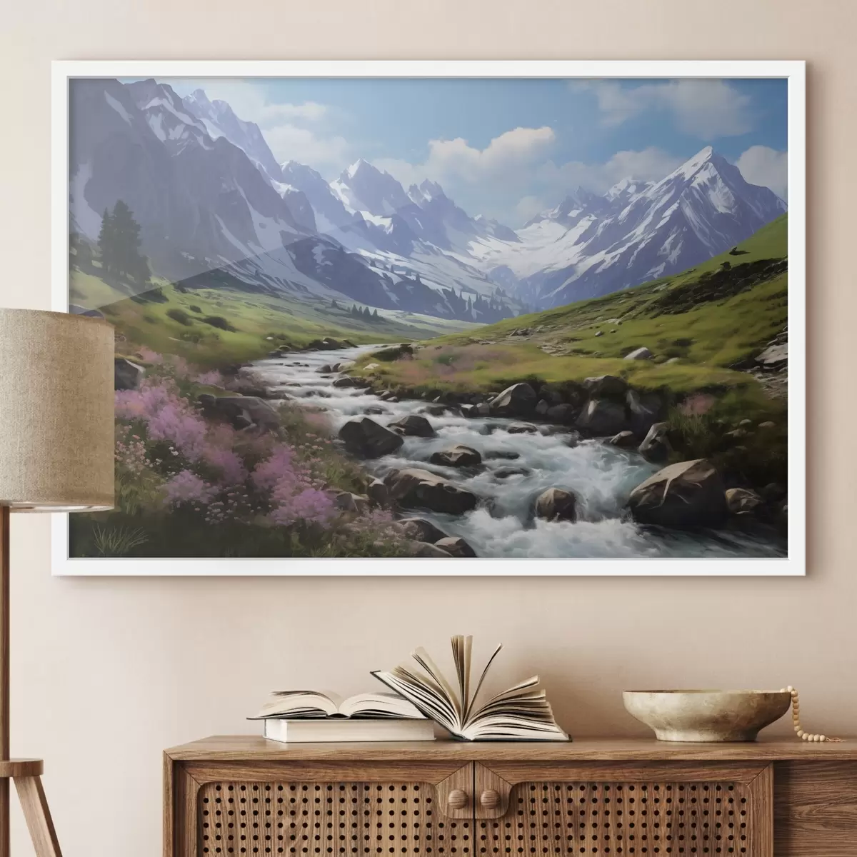 Plakatas Kalnų kraštovaizdis su tekančiu upeliu, žydinčiomis pievomis ir snieguotomis viršūnėmis horizonte po skaisčiai mėlynu dangumi. f42563
