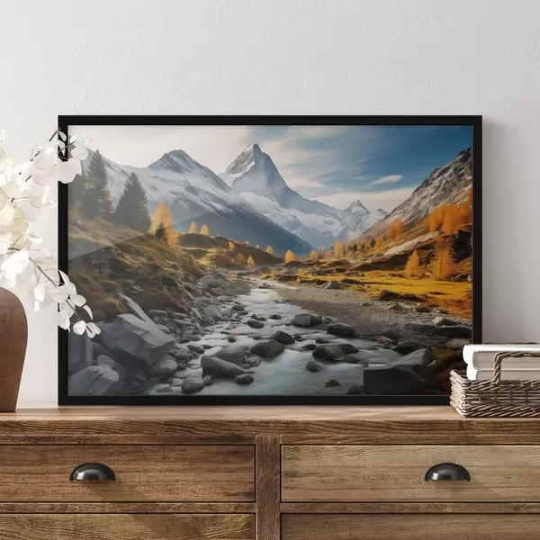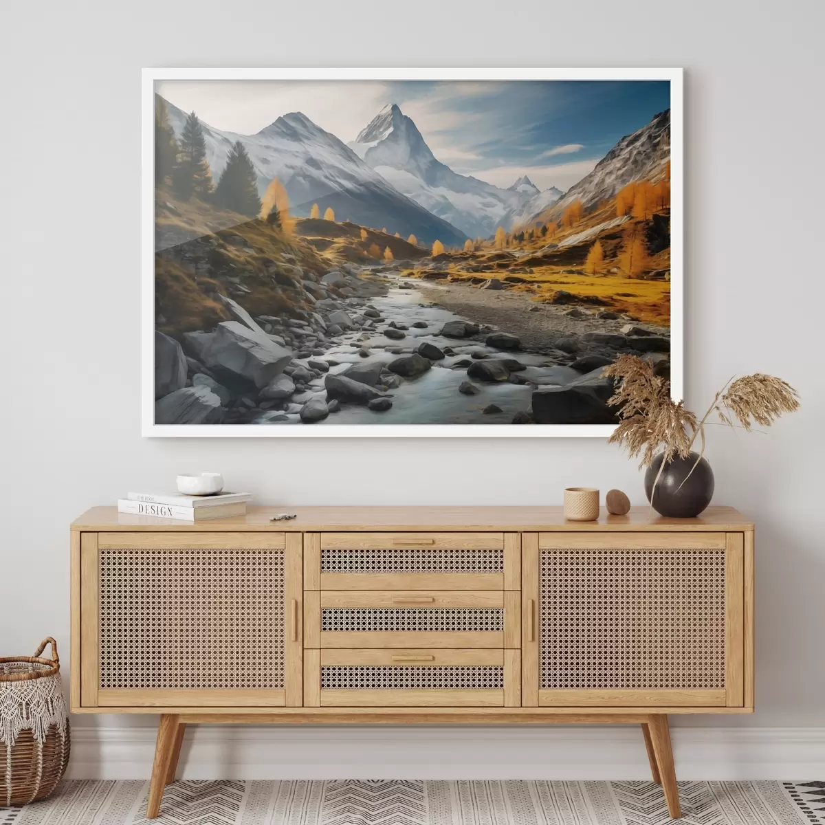 Plakatas Rudeninis kalnų kraštovaizdis su sraunia upe, auksiniais medžiais ir didinga viršūne šviesaus dangaus fone. Ne f42564