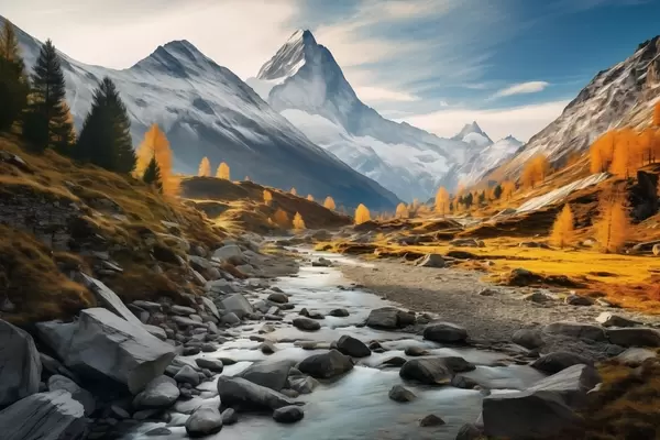 Plakatas Rudens kalnų peizažas su sraunia upe, medžiais ir didinga viršūne priešais skaidrų dangų. f42564