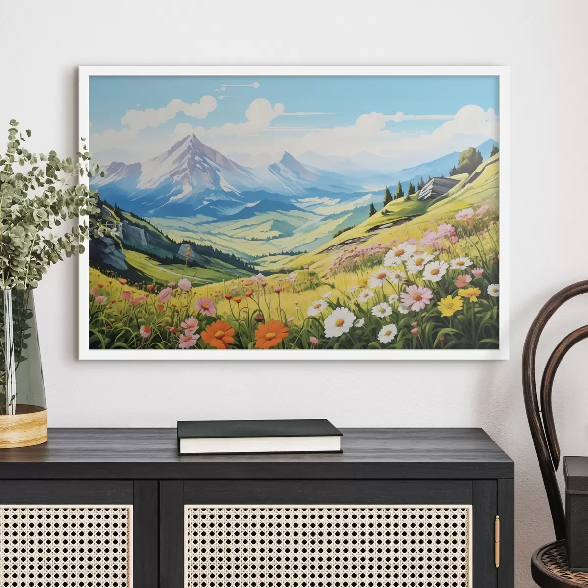 Plakatas Ryškus kalnų kraštovaizdis su žydinčiomis pievomis, žaliomis kalvomis ir didingomis viršūnėmis po žydru dangumi. f42565