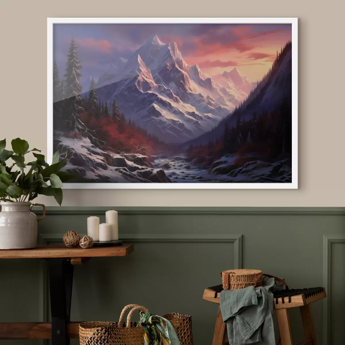 Plakatas Įspūdingas kalnų kraštovaizdis saulėlydžio metu su snieguotomis viršūnėmis, tamsiais pušynais ir švelniais rausvai violetiniais atspalviais danguje. f42566