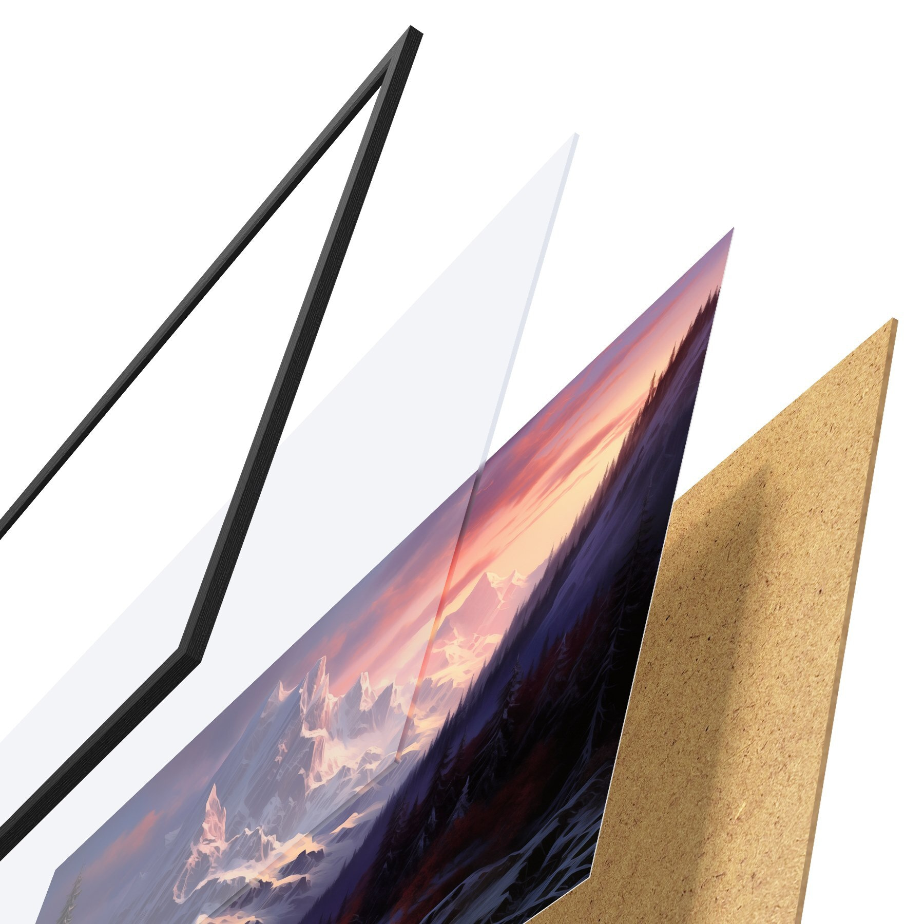 Plakatas Įspūdingas kalnų kraštovaizdis saulėlydžio metu su snieguotomis viršūnėmis, tamsiais pušynais ir švelniais rausvai violetiniais atspalviais danguje. Ne f42566