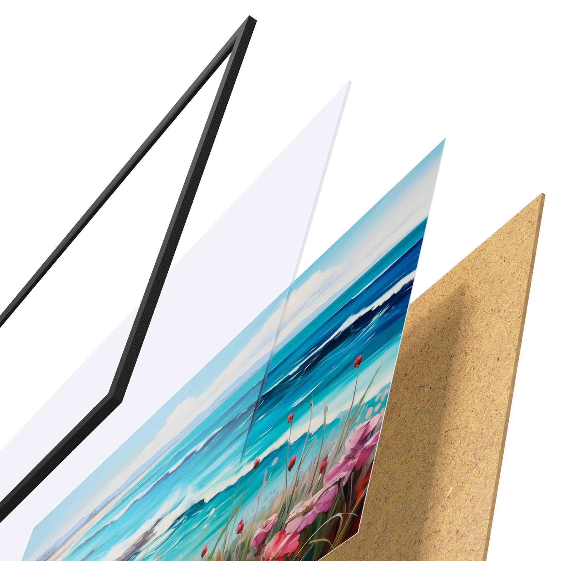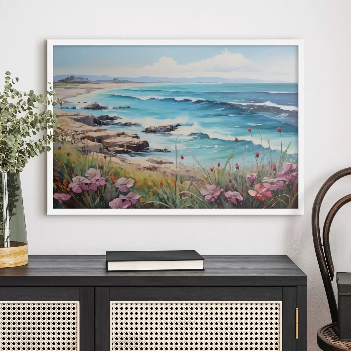 Plakatas Jūros peizažas su turkio spalvos bangomis, uolėtu krantu ir ryškiomis gėlėmis pirmame plane po žydru dangumi. f42568