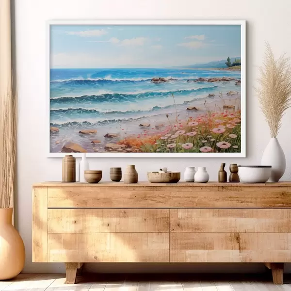 Plakatas Pajūrio vaizdas su turkio spalvos bangomis, žvirgždėtu paplūdimiu ir švelniomis rausvomis gėlėmis pirmame plane po šviesiu dangumi. f42569