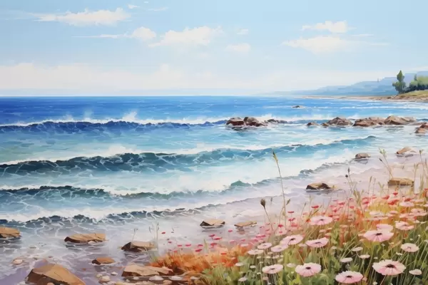 Plakatas Pajūrio vaizdas su turkio spalvos bangomis, žvirgždėtu paplūdimiu ir švelniomis rausvomis gėlėmis pirmame plane po šviesiu dangumi. f42569